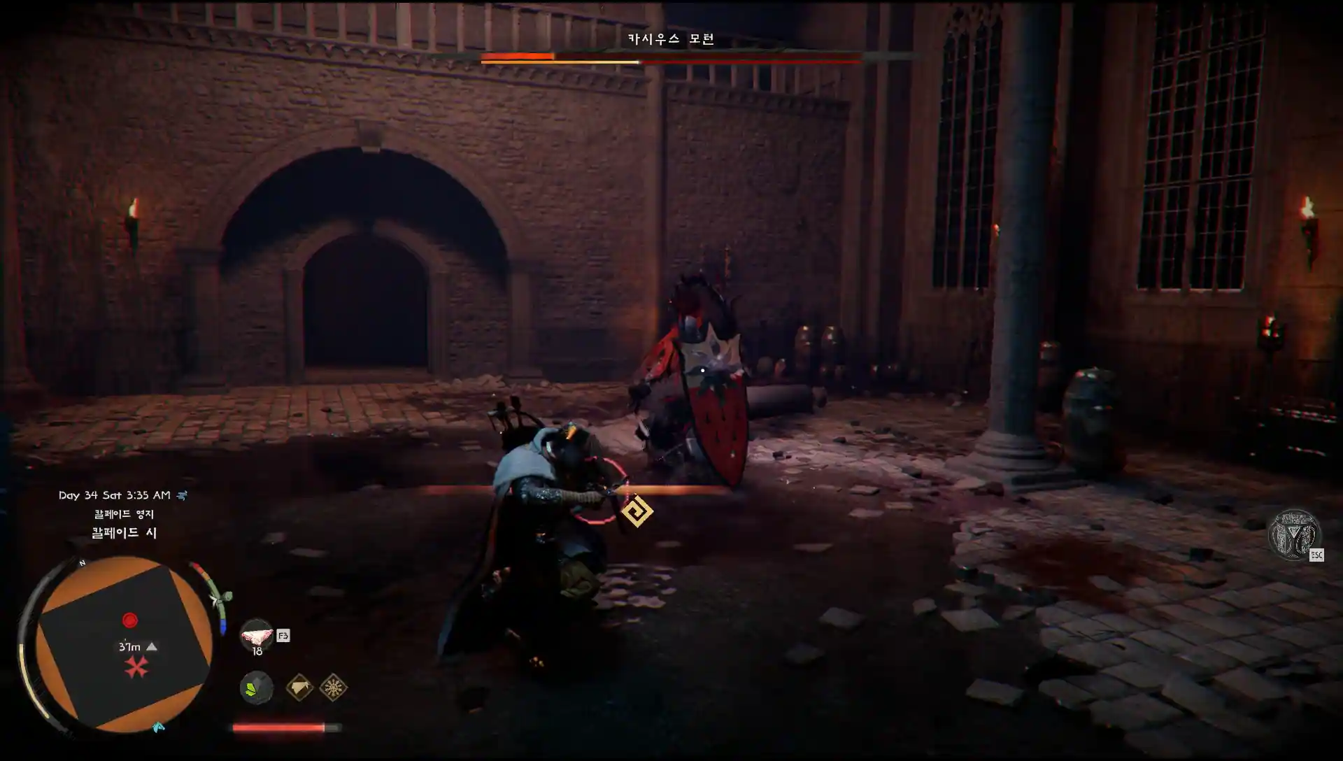 타협없는 방패 회복 패턴만 끊으면 쉬운 보스 1. [천군만마] 아군 스테판 랜포드까지 구해주면 그때부터 정비타임이다. 이후 음식을 미리 만들어두고 보스전에 대비하자 2. [배신자] - 카시우스 모턴 처치. 1페이즈밖에 없는 보스이며 다른 보스들보다는 전투가 할만하다. 대신, 모턴이 체력이 얼마없으면 방패를 크게 들고 찍어서 회복을 이어간다. 이때는 빛 모으기 기술을 사용해 회복 패턴을 끊어야 된다. 3. [잠든 전장] 랜포드 후작과 대화 4. [승전보] 봉화대 밝히기, 화살이 없으면 빛 모으기로 나무를 태우기 5. [다시 고향으로] 거점으로 돌아와 동료들과 대화 후 마무리