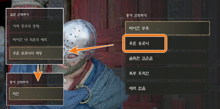 지하 창고의 정체 - 거짓 - 비밀 결사의 거점 - 거짓 - 베이겐 내 의문의 세력 - 거짓 - 베이겐 부족을 선택. 이러면 새로운 단서를 찾으러 퀘스트가 뜬다. 그러면 퀘스트 장소 건물에 들어가서 벽을 통해 엿듣고, 경비병에서 말을걸어 푸른 송곳니 - 푸른 송곳니의 대장까지 거짓 선택지를 눌러간다.